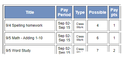 Each pay period, assignment given during a pay period are entered into the system. The maximum score is included along with the Pay Points that can be earned for the assignment. Note: 'Pay point' is the name of the money used in this economic system.